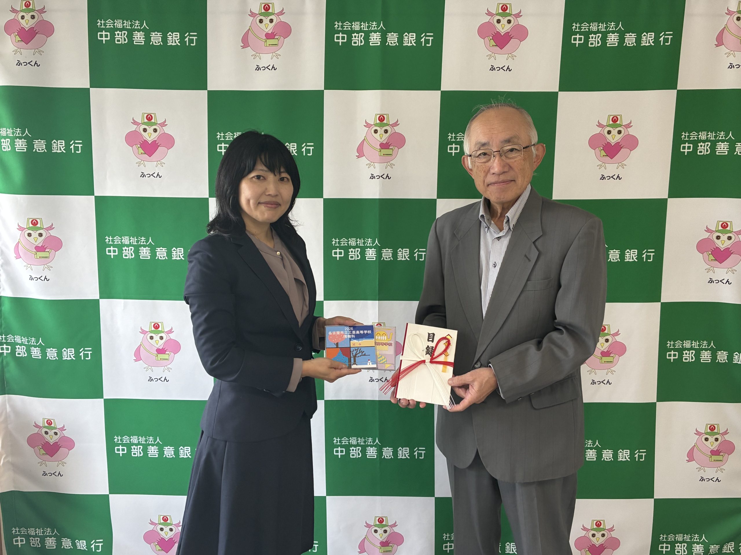 11月6日(木)、名古屋市立工芸高等学校 情報科様より、10月25日(土)に開催された文化祭での手作りカレンダーの売上金10,000円と手作りカレンダー33個をご寄附いただきました。同校情報科の加藤ひとみ先生(写真左)から、鈴木常務理事に目録が手渡されました。ありがとうございました。