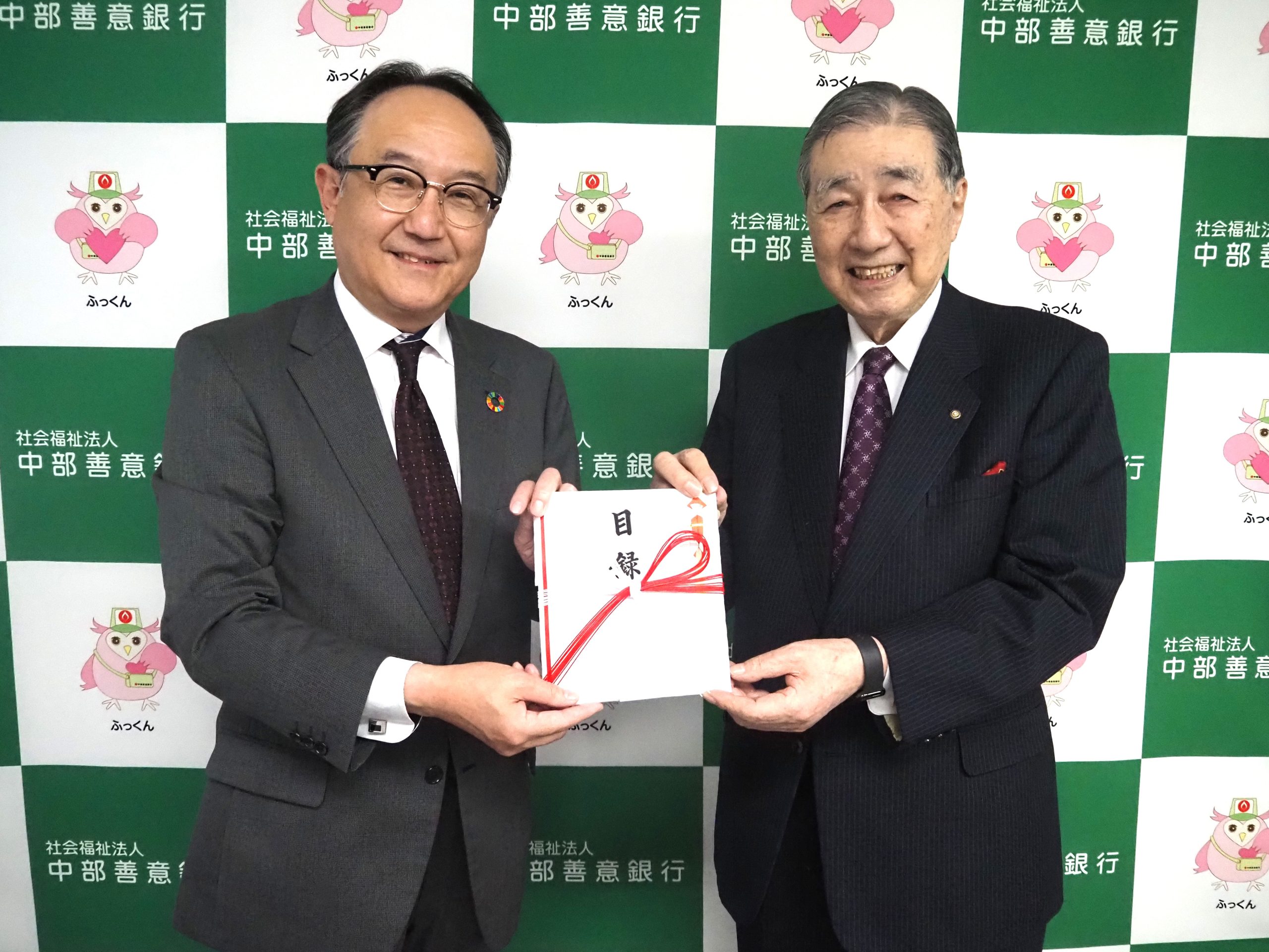 名古屋銀行様から「福祉活動に役立ててほしい」と、11月27日に愛知県芸術劇場コンサートホールで開催された「第44回名古屋銀行チャリティーコンサート」の売上金の一部、100万円を寄附していただきました。12月8日に中部善意銀行事務局に於いて、同行の清水貞晴常務(写真左)から当行の岡田邦彦理事長に目録が手渡されました。2009年から毎年寄附していただいており、今年で17回目(合計1,856万4,000円)となりました。年末に行う児童、障害児者、高齢者施設等への支援事業に活用させていただきます。
