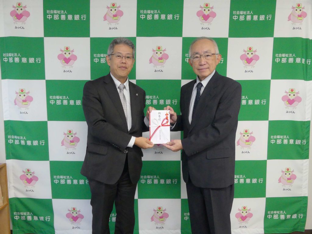 リンナイ株式会社様(名古屋市中川区)より、 「年末たすけあいチャリティー募金」に10万円を寄附していただきました。小川拓也常務執行役員管理本部長(写真左)が当行事務局にお越しいただきました。