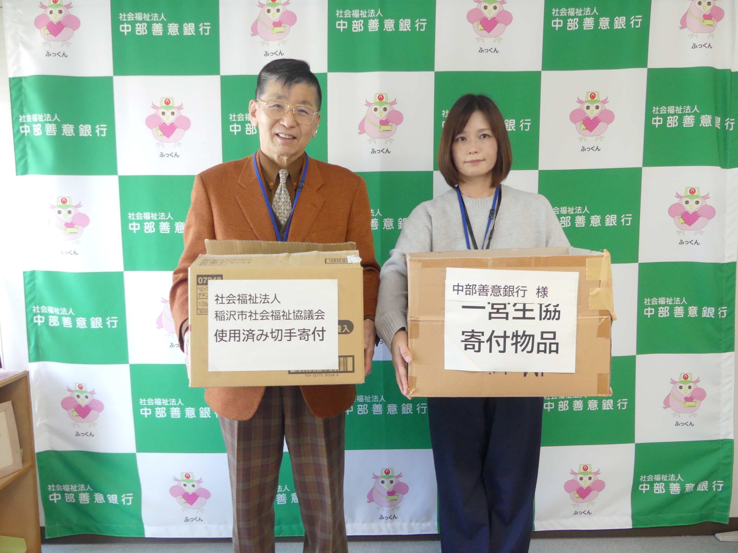 稲沢市社会福祉協議会ボランティアセンター様より16.2kg・一宮生活協同組合様より10.6kg、「社会福祉に役立てて」と使用済み切手を寄附していただきました。稲沢市社会福祉協議会東部支所長の菱田浩正様と松井様が当行事務局まで届けていただきました。中部善意銀行では、皆さまからご寄附いただいた使用済み切手を社会福祉事業に活用しています。