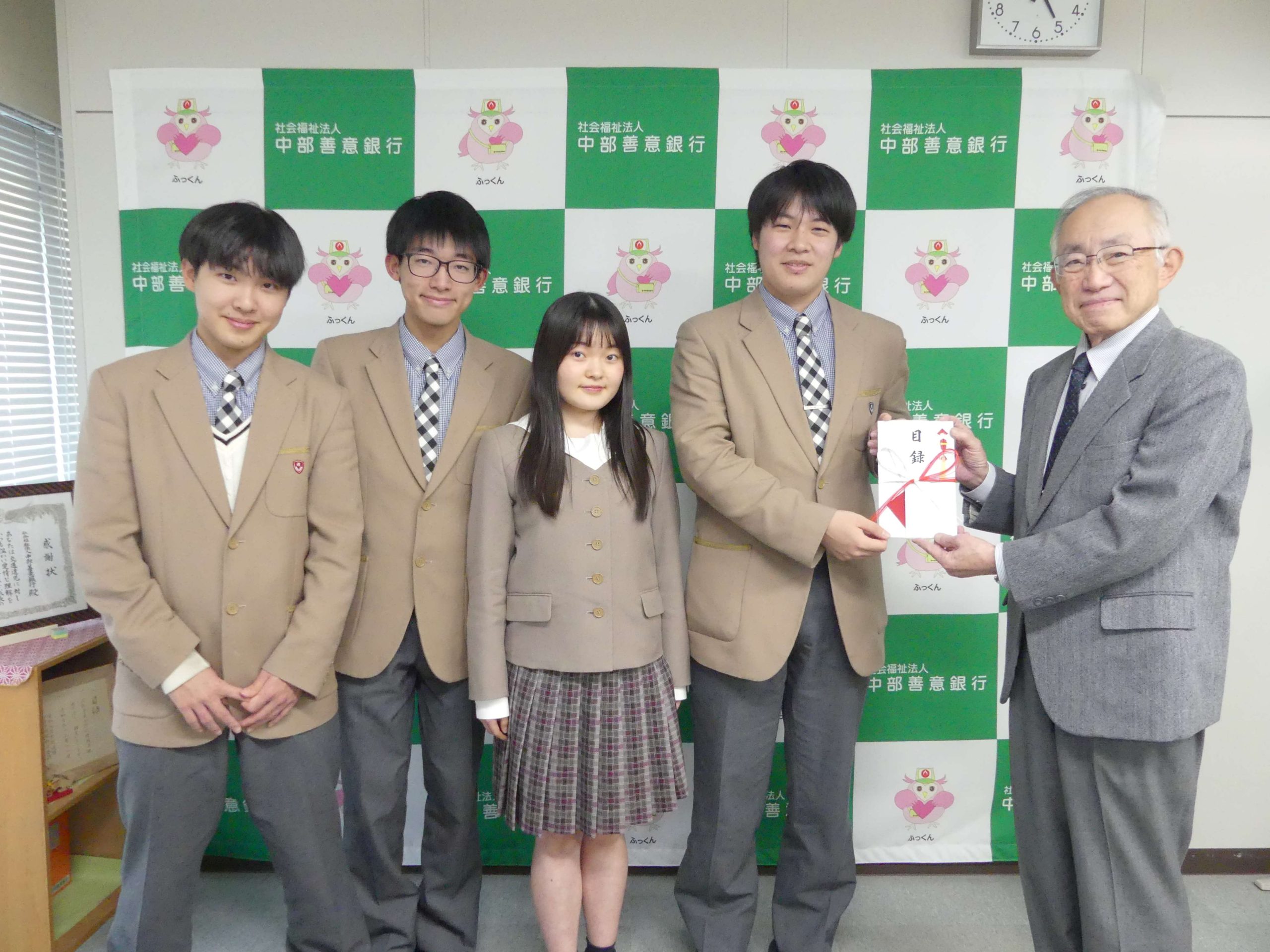 名城大学附属高等学校様より、「社会福祉に活用してほしい」と、昨年10月に開催された文化祭での模擬店などの売上金23万5,534円をご寄附いただきました。2月18日(水)に、同校生徒会長の竹村悠生さんはじめ役員4名の皆さんが中部善意銀行事務局にお越しいただき、当行の鈴木常務理事に寄附金が手渡されました。