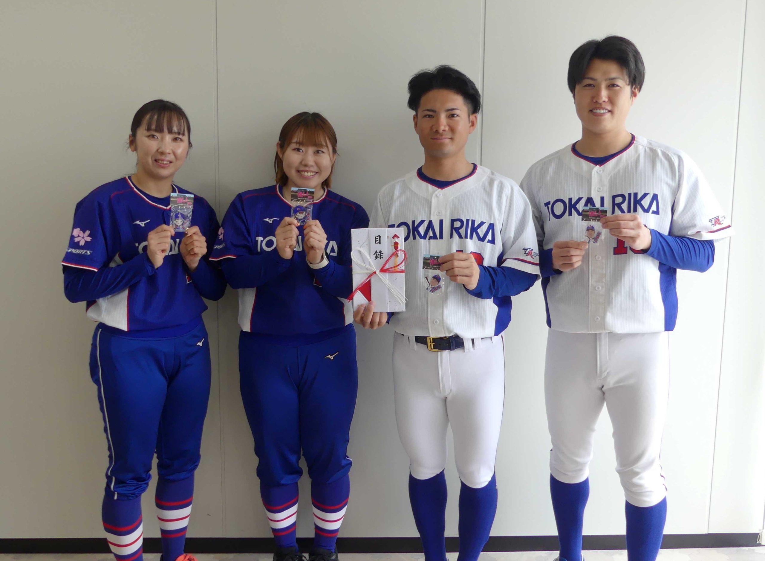 株式会社 東海理化様(丹羽郡大口町)より、「障害者福祉に活用してほしい」と、25万円をご寄附いただきました。廃棄物の削減と資源の有効活用をテーマに、コロナ禍で感染防止のため社内で使用していたアクリル板を再利用し、同社硬式野球部と女子ソフトボール部の選手をモチーフにした「キーホルダー」を作製し、試合会場やインターネットで販売。売上金の一部を社会貢献活動の一環として、今回ご寄附いただきました。2月24日(火)に、硬式野球部と女子ソフトボール部の選手4名の皆さんが中部善意銀行事務局にお越しいただきました。