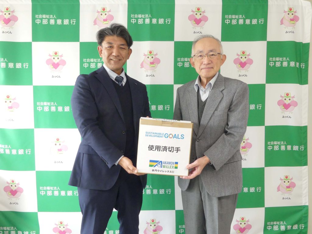 赤門ウイレックス株式会社様(長久手市)より、「社会福祉に役立てて」と使用済み切手2kgを寄附していただきました。同社執行役員管理本部長の平井幹人様(写真左)が当行事務局まで届けていただきました。中部善意銀行では、皆さまか […]